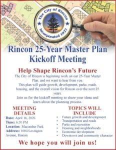 Community input is a critical component of this process. The City will host a public kickoff meeting to introduce the planning process, gather feedback, and provide an opportunity for attendees to share their vision for Rincon’s future.